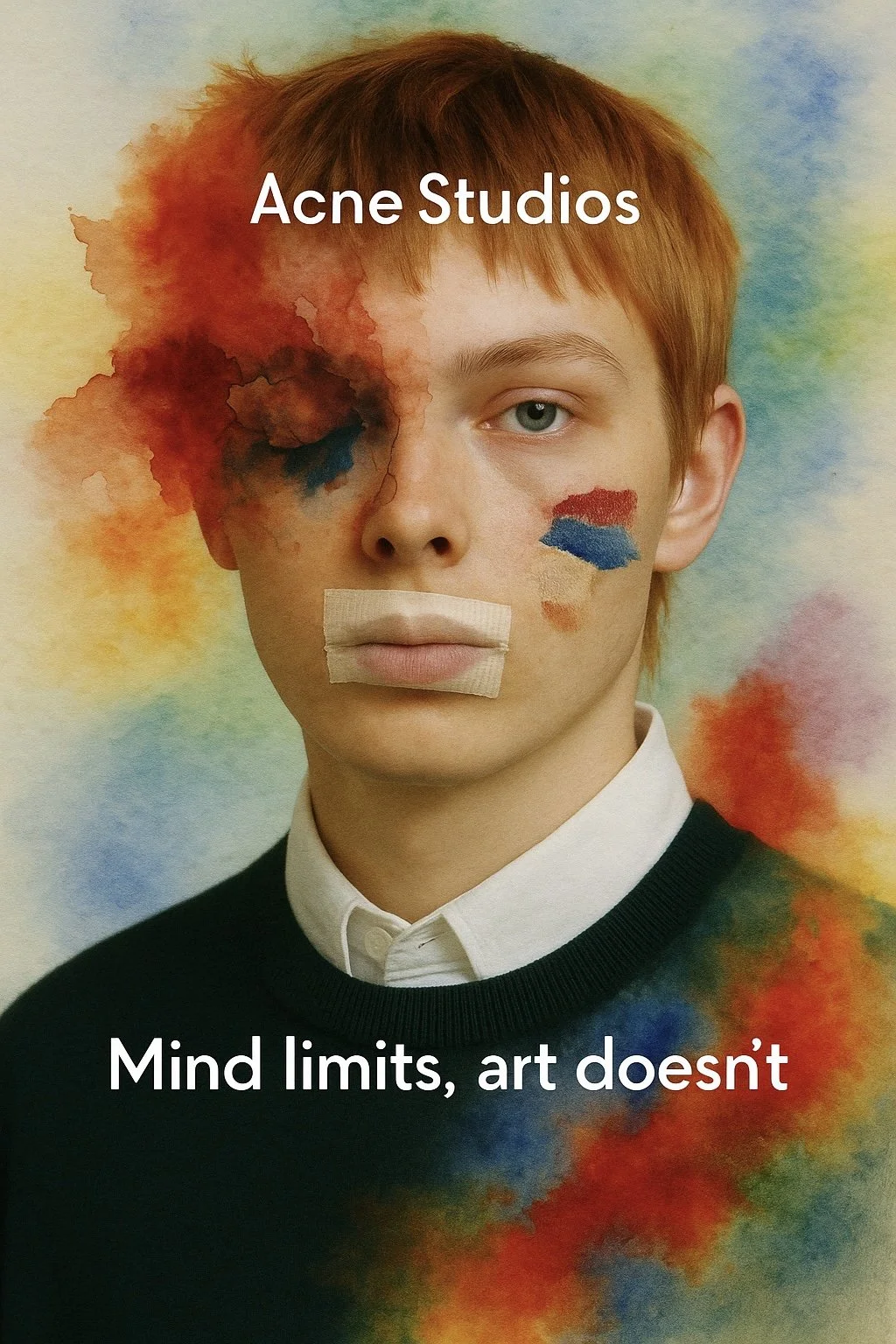 The core message — Mind limits, art doesn’t — became both a provocation and a permission slip. We crafted a visual language where the boundaries between subject and medium collapse: faces dissolve into watercolor, expressions blur into abstraction, and even objects — like the teddy bear — become symbols of identity restrained, taped into stillness.